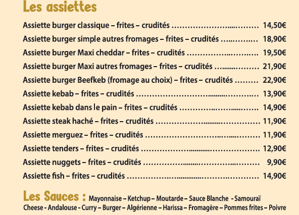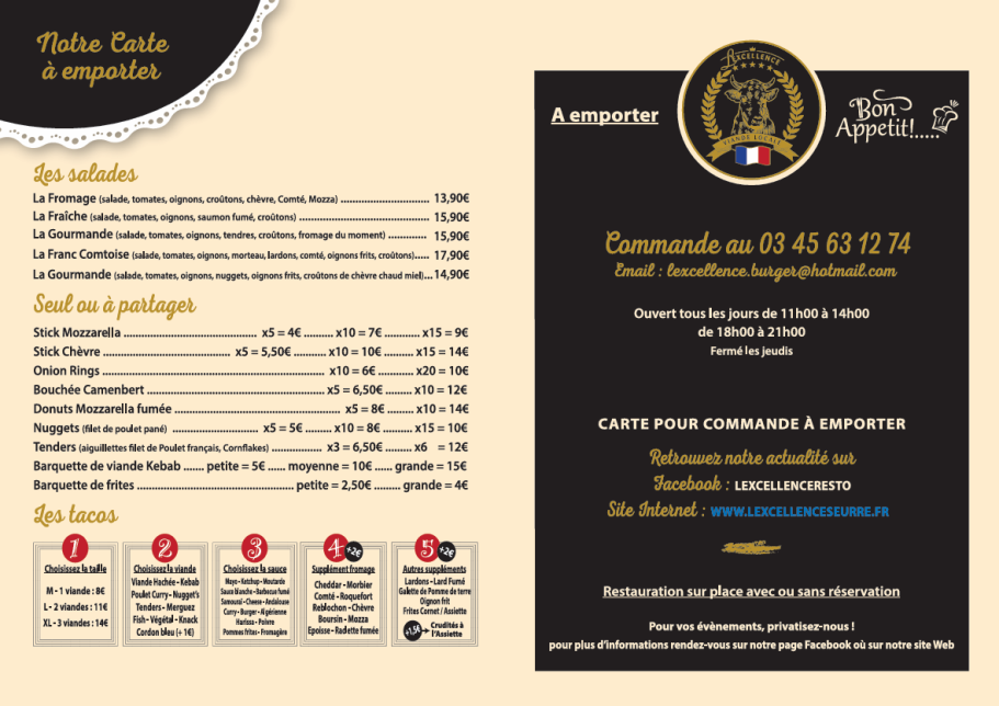 Lexcellence situé centre ville de Seurre, vous propose un service sur place ou à emporter avec au menus : Burgers, Tacos, Kebab, Salades, Hot Dogs, Panini.
